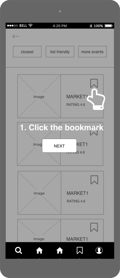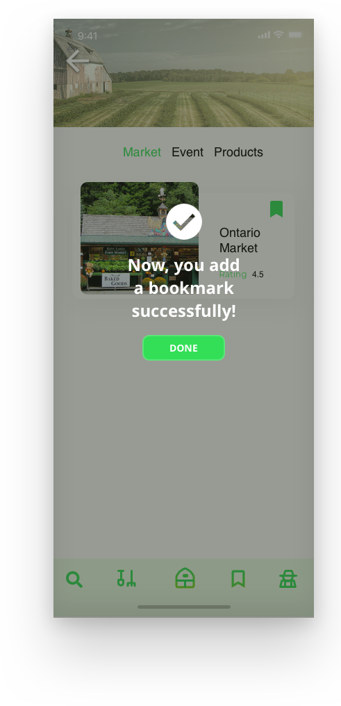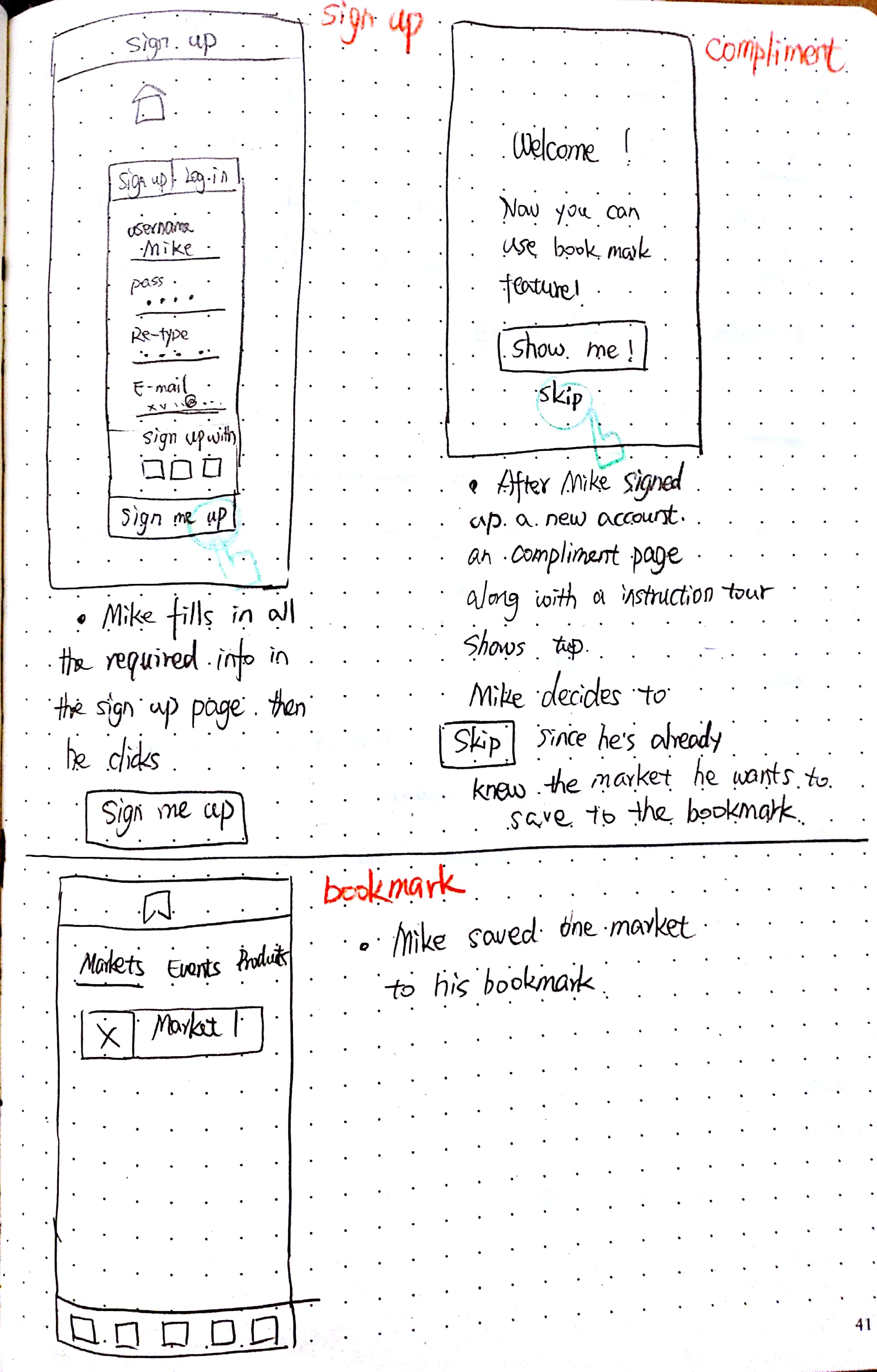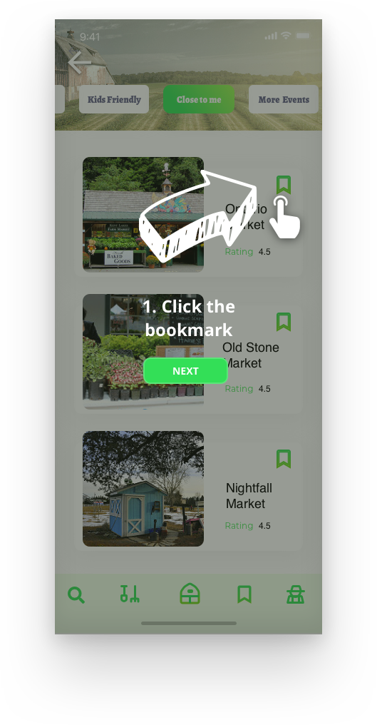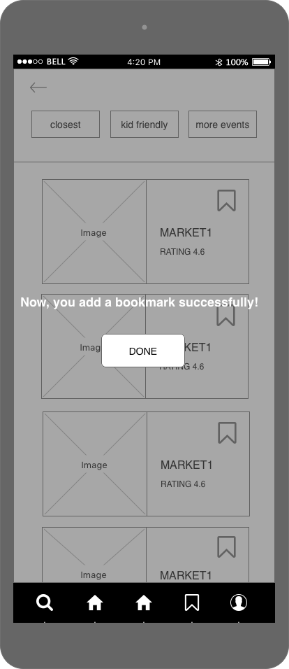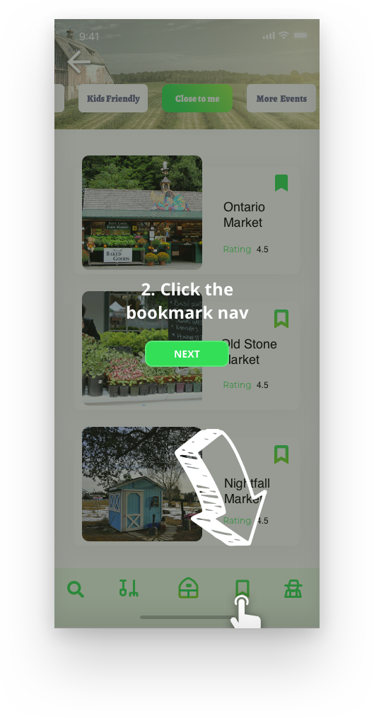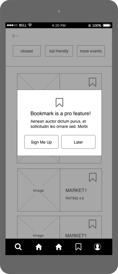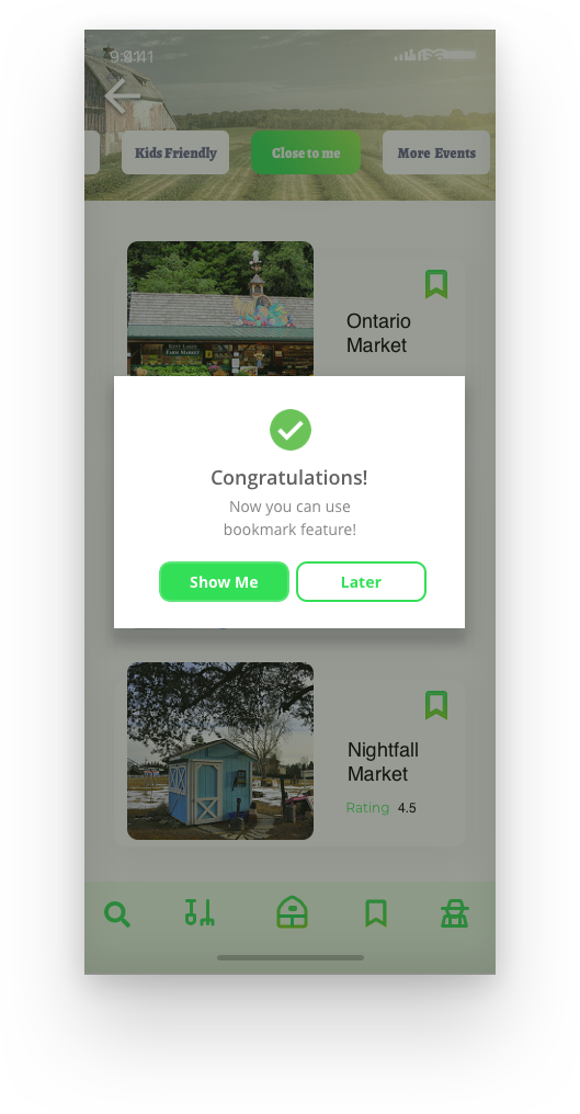 2. Don't force user to sign up or log in when they just download the app. Set some pro features to let user decide after they've been spending time on the app. For my design, I decided to add one bookmark feature. When user want to save their favourite market or event, a notification will pop up and suggest user to log in to get this pro feature.